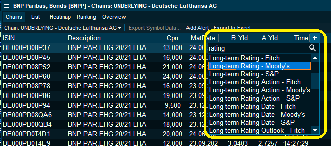 Following the integration of contributor bond data, credit ratings provide an added layer of insight into the debt market and its inherent credit risk. Ratings data is provided by the market leading agencies S&P, Moody's and Fitch* and includes ratings on the individual bonds on the issue level as well as the issuer on the overall entity level.