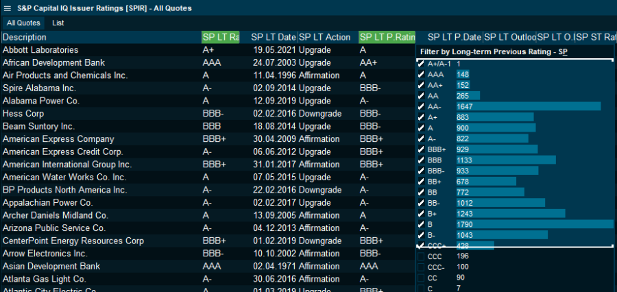 - In the "Market" and "Watchlist" view, this can be applied across the agencies to show multiple rating agencies' columns (that is, S&P and Moody's). Moreover, the column filtering tool displays the distribution in a certain market or from the agency universe.