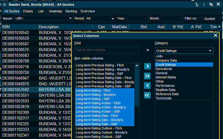 Columns can be added by using the "+" icon on the right of the columns. Or you can view the full selection in the "Select Columns" dialog window by the "Credit Ratings" category:
