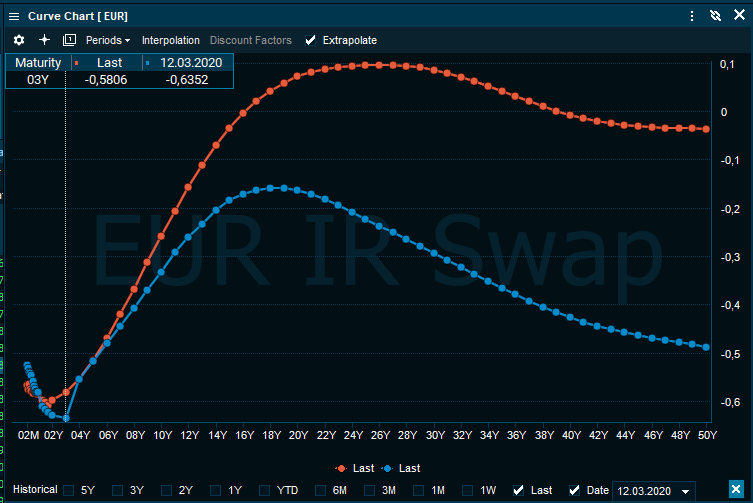 Interest rate swap curve in euro on March 12, 2020, when WHO declared COVID-19 a global pandemic compared to the current Last value (in this case February 21, 2021).