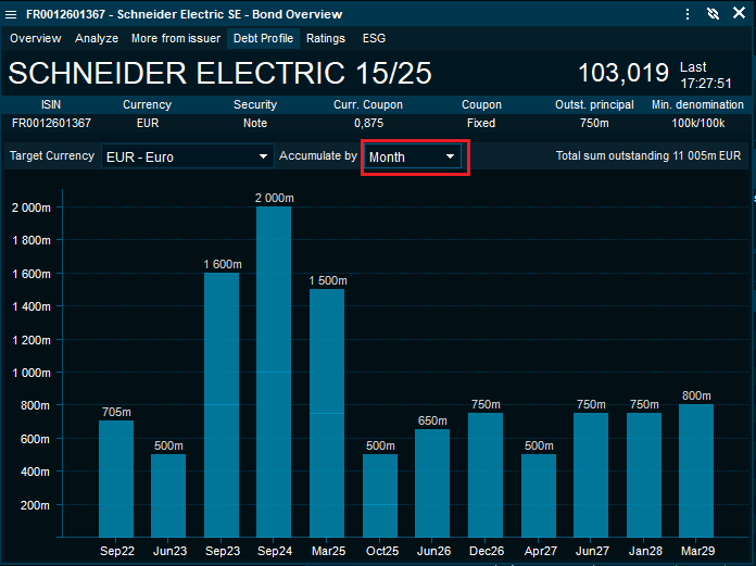 The "Debt Maturity" profile now detects the number of outstanding bonds from the issuer and dynamically optimises the presentation of the bar chart. Thus, a bank with several hundred mortgage bonds will be summarised to single columns on an annual basis for a view that is easier to read.