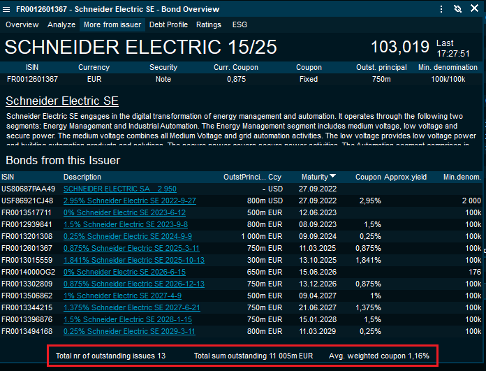The number of issues, total sum outstanding and weighted coupon is summarised for this issuer: