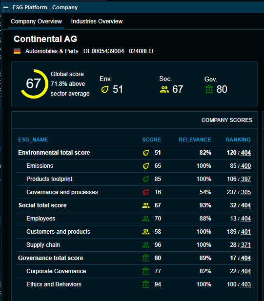 - Individual scores are available in the "Details" tab of every "Instrument Overview" window and included in the "Peer group" overview on the "Company Overview" tab.