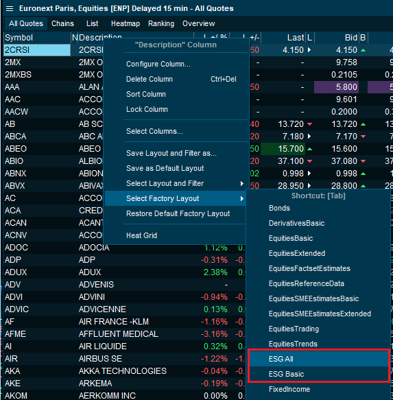 - In addition to a new column category found in the configurator, two new ESG layouts were added to the factory layouts and can easily be applied to any market overview or watchlist.