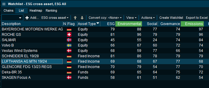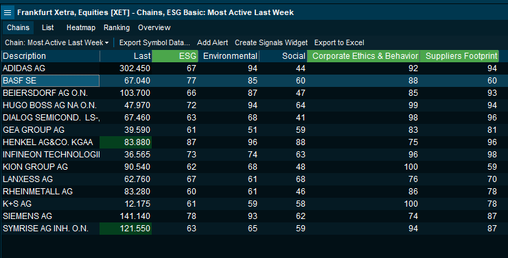 - A new column set is introduced to be applied in market overview and watchlists to bring forward this advanced dataset. Applying the terminal's column sorting and filtering, this enables you to easily screen and structure an entire market based on overall ESG score. Detailed parameters such as Supplier Footprint or Corporate Ethics may be applied as well as seen in the example with the Xetra exchange below: