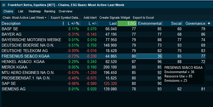 - By applying the ESG Basic layout to the Xetra main market, you can filter out only the top ESG score candidates by sliding the bar in the column filter. For example, you will find that even though Fresenius falls within this range at the total score, Fresenius' "Environmental" score is quite poor at 36 further explained by the third level parameters shown in the hover, clearly weakened by the "Emissions" score at only 25.