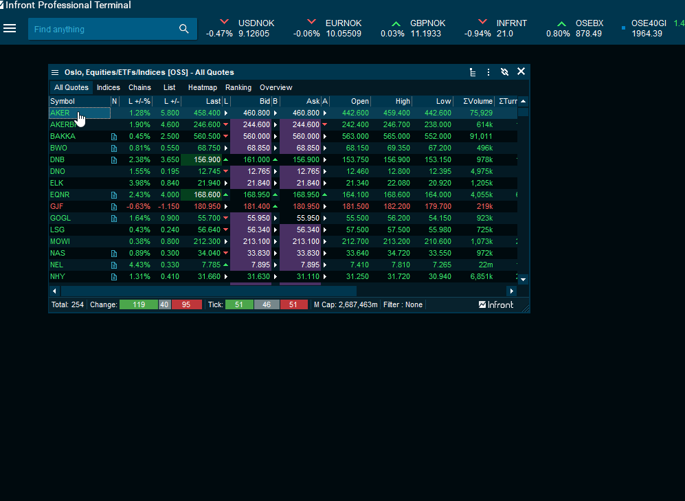 The "Focus" window gives the user a quick overview of one specific instrument. The symbol field can show either the symbol ticker or full symbol name of the instrument. The price field allows the user to select between last bid or ask, and below either change +/- change +/-% or both are displayed. At the bottom, the change indicator will display the current trend based on the price field. The right part of the window consists of a range panel, with values in both ends displaying today's high and low. An arrow indicates where the price is according to high/low, and the bar will be red on negative since open and blue on positive.