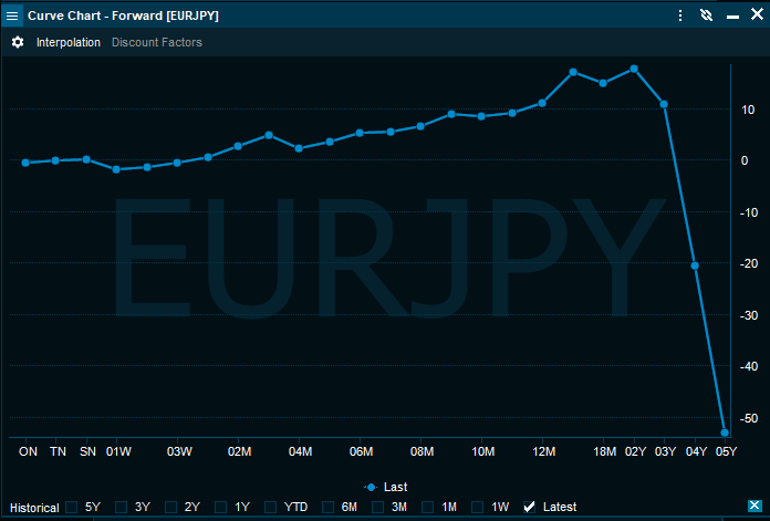 You can display a forward curve, points and rates, for the chosen currency pair by clicking "Forward Curve". The curve is adjusted once the user changes the currency pair. You can also display a forward curve chart by clicking the chart. The chart is built by using the forward points of the chosen currency pair. When changing a currency pair, the chart is not adjusted automatically.