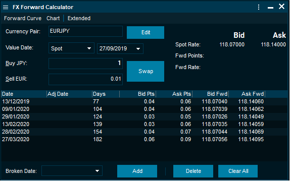 You can calculate forward points and rate for a single date by entering a currency pair and a value date. The value date is either a standard tenor (1M, 3M) or a broken date. If the chosen value date falls on a non-business day, it will be rolled-over to the following business day automatically.