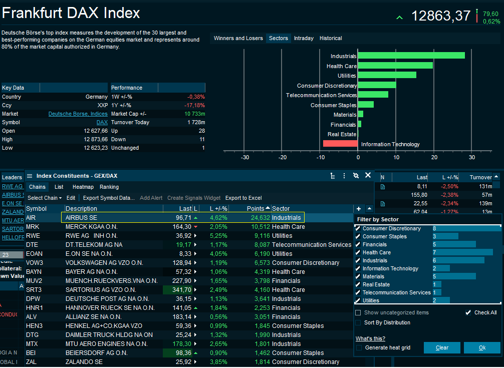 In the example below, we see the DAX index heavily influenced by the German industrial sector whereas the IT sector partially counters that effect.