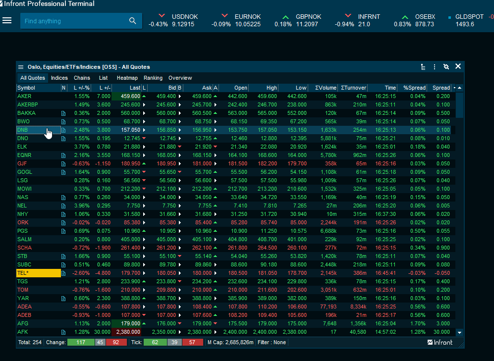 The "Instrument Overview" window is one of the most frequently used windows in Infront Professional Terminal. There is a lot of content packed into a small amount of space, separated by tabs.