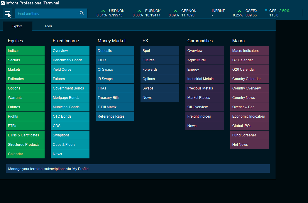 - Go to the main menu > Select "Markets" under "Equities" > Type in the preferable market and press <ENTER>.