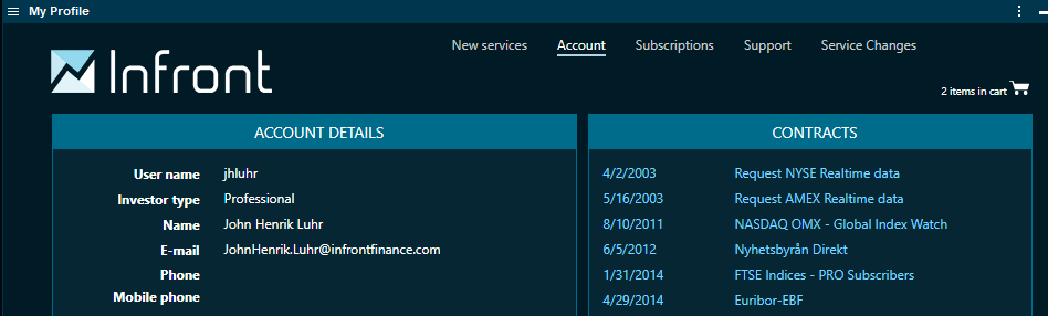Click the "⋮" icon in the upper right corner of Infront Professional Terminal and then select "My Profile".