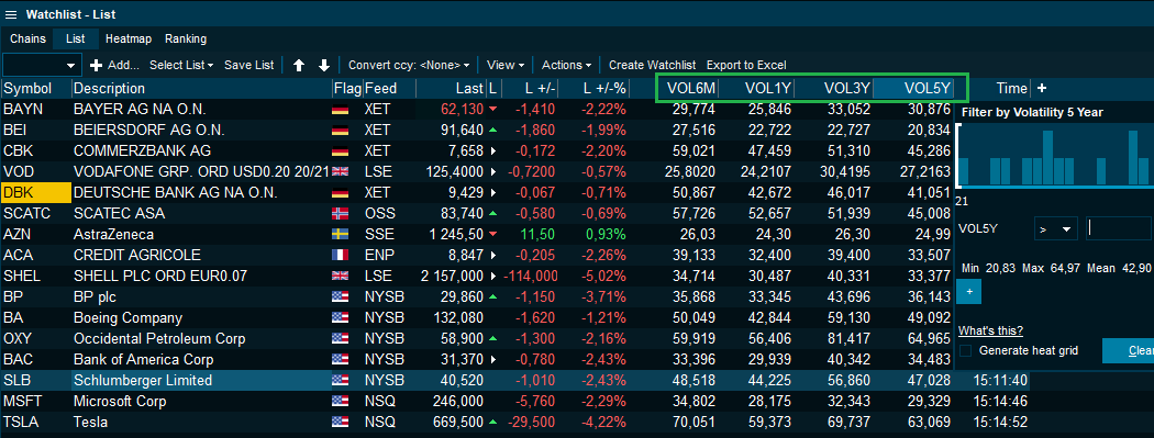 Historic volatility for 6M, 1Y, 2Y and 5Y calculated on daily closing prices can now be viewed directly in the watchlist, further enabling for screening and sorting to discover and isolate extremes or rank candidates of your selection.