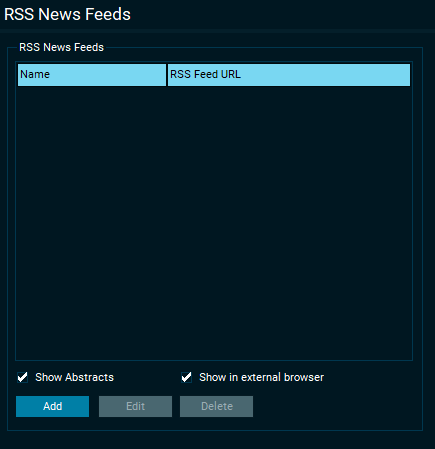 Add RSS news feeds to the Infront Professional Terminal and see them in a "News" window. Right-click in the news window, and then select "Sources". Then find the "RSS News Feeds" category and select your news feeds.