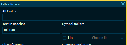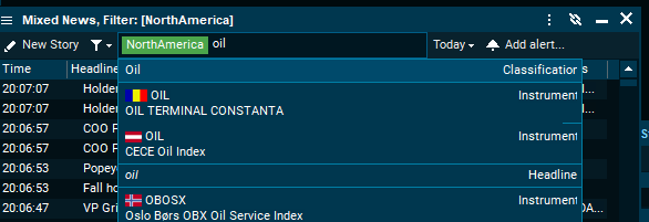 Filter news by typing directly in the search field. For example, you can search for "North America" and see the filter criteria on the right hand side is "Geographical Area". If you also add "oil" in the search field, you can see that this can be filtered as a "classification".