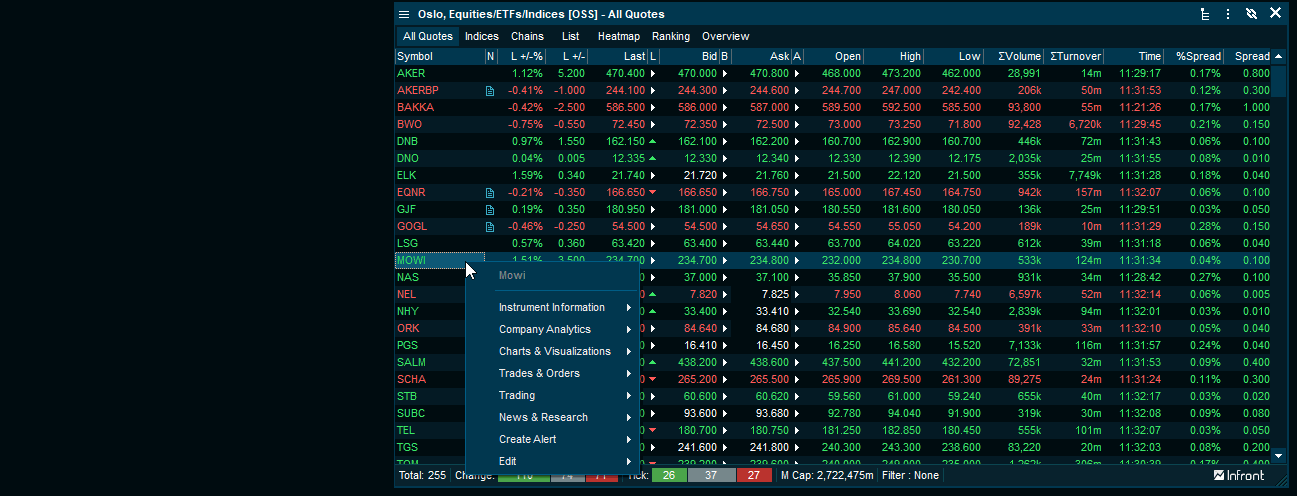 Orderbooks display public buy and sell orders and are available as MBO (Market by order) and MBL (Market by level). Infront offers access Level 1 data, Level 2 and full depth data depending on access and market, as well as consolidated orderbooks (combines orderbooks from the main listing exchange with multilateral trading facilities).