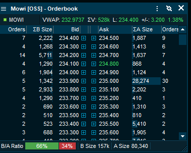 - Summary line 2: Orders / Bid Size / Bid / Ask / Ask Size / Orders