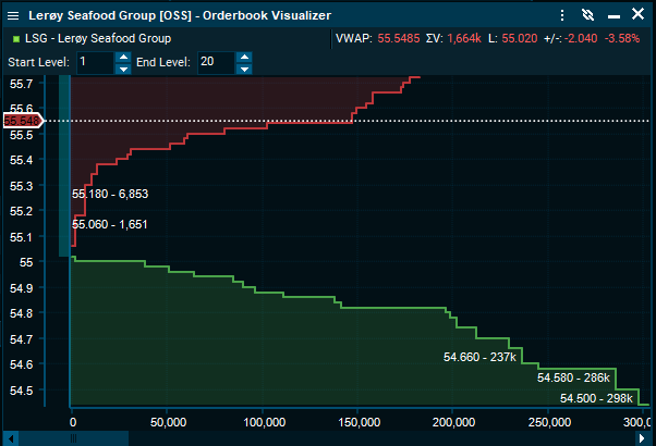 For the identification of the market sentiment for the instrument, the scope of interest is high since the order book is more informative about the aggregate supply and trading interests than quoted volumes and prices. With the possibility to compare today's liquidity dynamics with respect to averages, the analysis will be enhanced, allowing the user to spot changes on the instrument's liquidity supply. Moreover, the range of prices at which the chart analysis is performed has also different usages. Let us consider the analysis of the time series. The time frame selection is obvious and it depends on the user's interest, and this will also define the price range under analysis. Working with a live feed of the orderbook, the range selection is less obvious and we then provide the user with range filters that will facilitate the reading of the chart and the inference of information. If the user analyses the orderbook with the full range, that is, from the minimum value of Bid and the maximum of Ask, then the use of the OB Visualizer is to read changes on the expectations regarding the fundamental price of the instrument. For example, one might notice that closer to earnings release dates the shape will tend to widen, that is, the bid and ask legs will spread out.