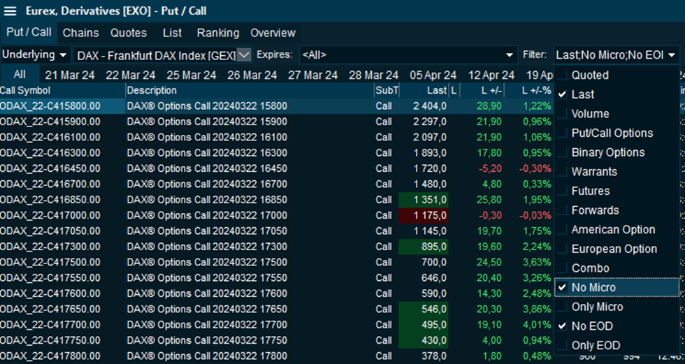 For instance, in the Eurex, Derivatives [EXO] feed we have added four new options to the Filter drop-down to the right in this screenshot; No Micro, Only Micro, No EOD and Only EOD: