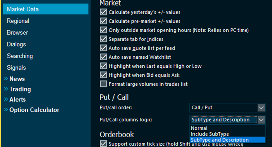 When editing the list of columns to show in the Put Call page, there is special logic to mirror and duplicate some of the columns to show field values for both the put and the call options on the same line. By default, to save horizontal space in the window, adding a Description column will only be used on the left (Call) side. For some markets in makes more sense to show the descriptions on both the Call and the Put side, so we have added a setting to enable this: