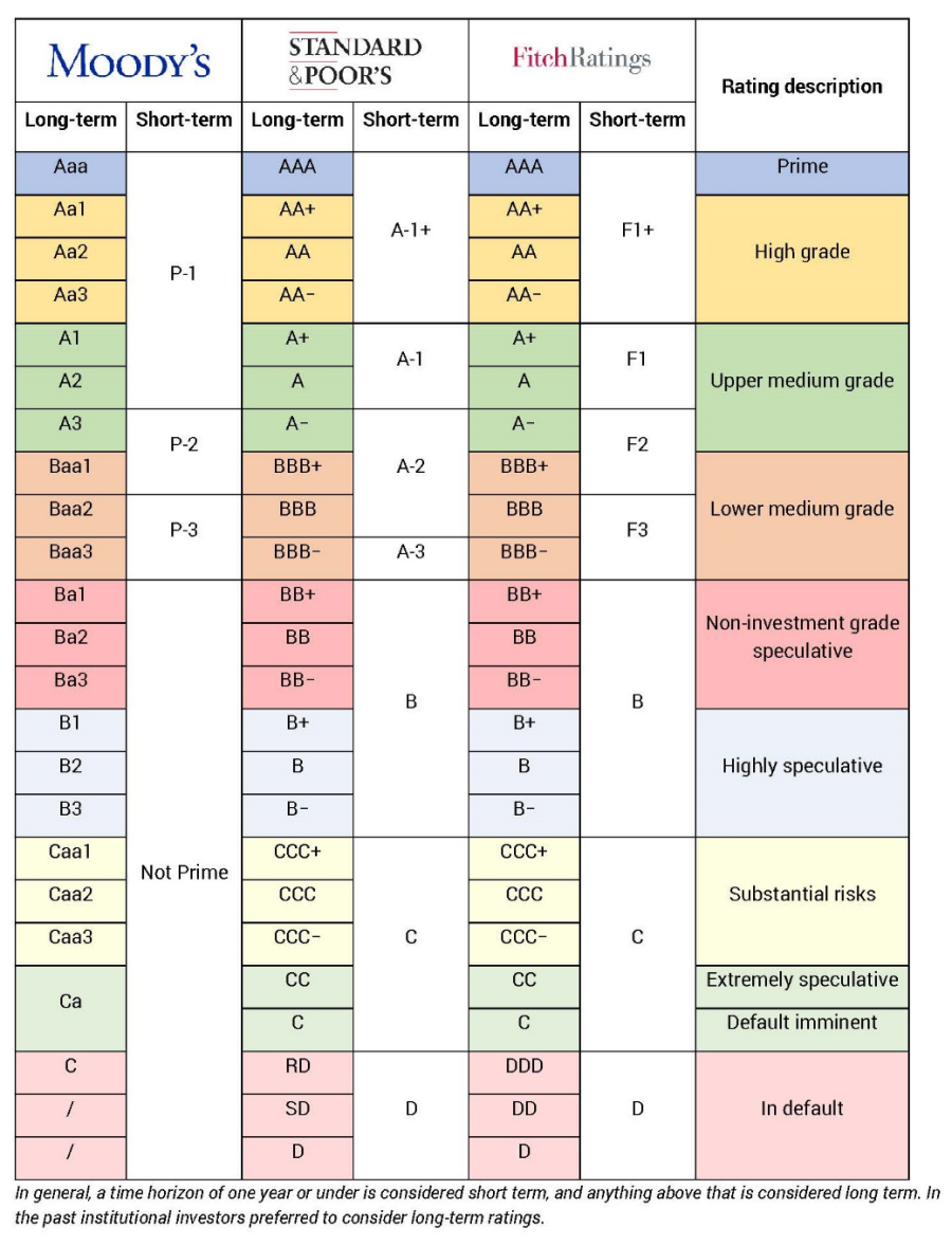 For reference, please see the following resources available directly from the credit rating agencies. S&P and Fitch share the same scale while Moody's operate with their own scoring with Aaa to C: