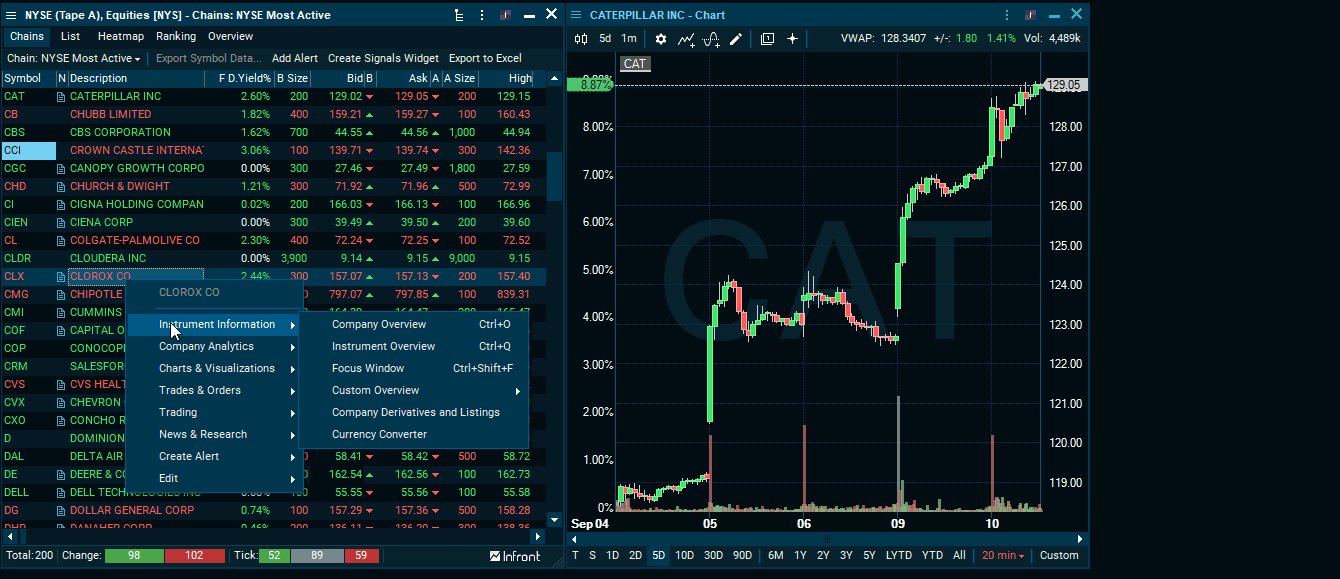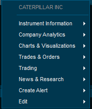 Right-click any symbol to access the menu options for the given symbol. For example, right-clicking the ticker "CAT" opens the following menu.