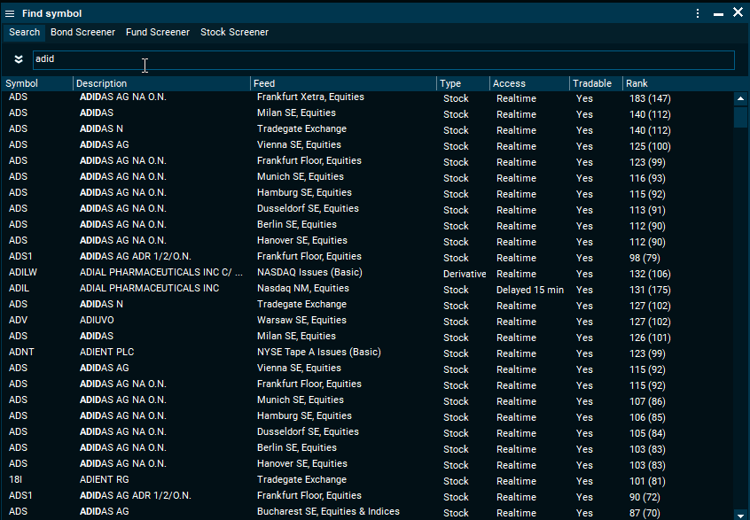 The first tab is called "Search", where you can find different types of asset classes. From here, you can search for name, ticker or ISIN codes to find the instrument that you are looking for. The results will give you the ticker, description, feed and asset class.