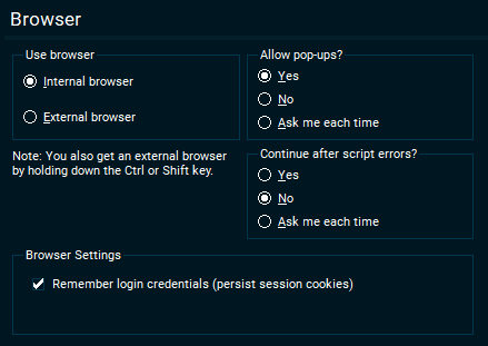 Choose internal or external browser and decide if you want to allow pop-ups or not.