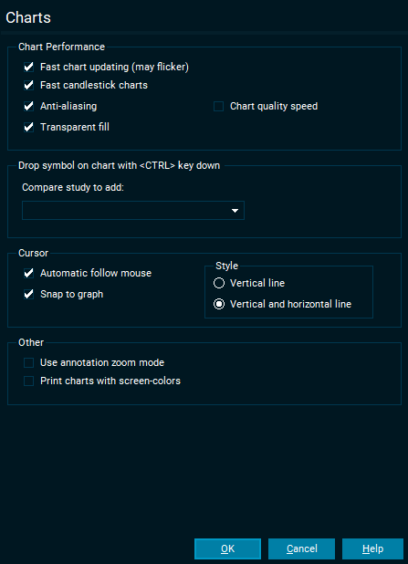 Drop symbol on chart with <CTRL> key down | This setting controls what type of compare chart you get if you hold down the <CTRL> key when dragging and dropping a symbol into the chart. |