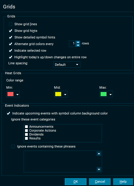 Line spacing | Refers to the space taken by each row in a market window, news window, custom lists and orderbooks. You can increase the spacing to improve readability or decrease to save space. |