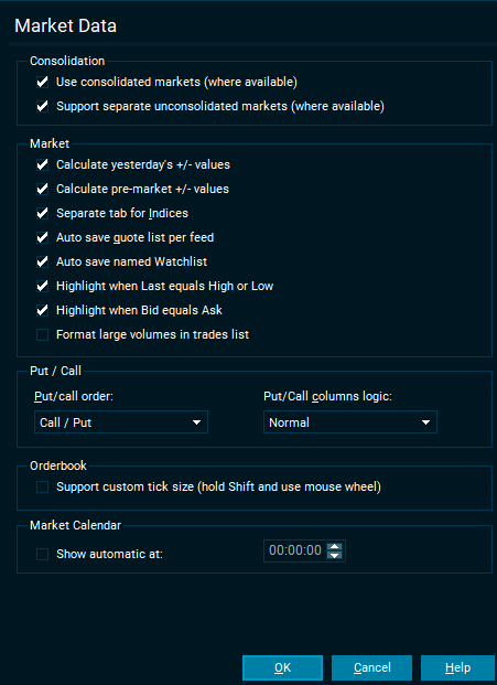 | Support separate unconsolidated markets (where available) | Instead of consolidating market data to one market place, switching this option on will give access to the unconsolidated feeds separately. |