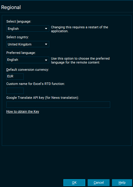 Infront Professional Terminal will try to detect an appropriate default country and language for your Infront Professional Terminal. If you want to change this, you can select a preferred default country and language.
