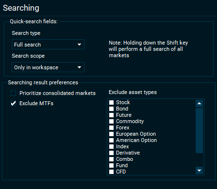 | Search type | Select between "Full search" (ticker and instrument name) and "Ticker" when using quick search inside market windows, custom lists, charts, orderbooks and more. |