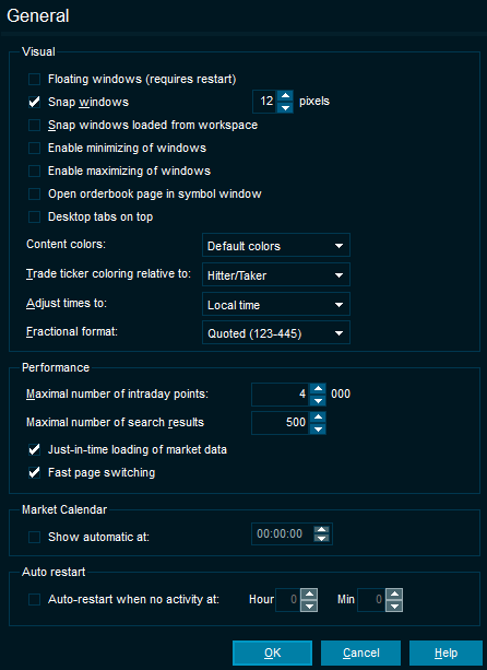 Auto-restart when no activity at | If there is no user activity (no mouse or keyboard activity detected in the last 4 minutes), then the Infront Professional Terminal automatically restarts, saving and restoring the current workspace at the time you specified, for example at 20:00 (8 P.M.). |