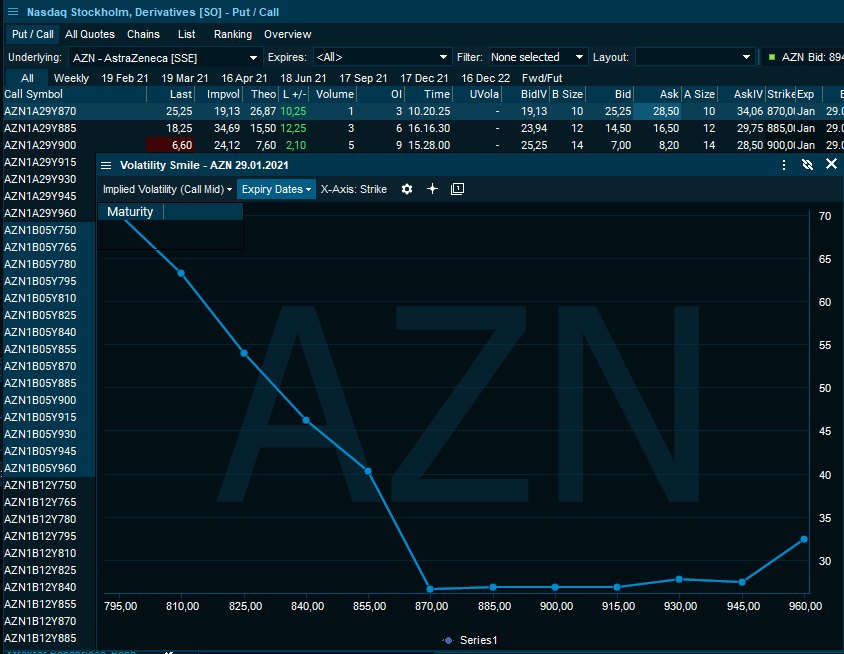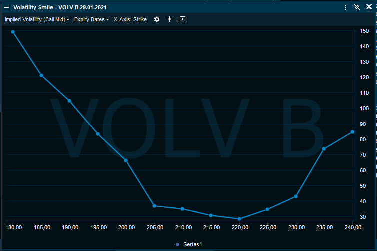 Open an option market, right-click and select "Volatility Smile" under charts and a series of 6 steps below and above of strike prices are selected and is charted to easily see if the typical U shape for your selected strike range and its moneyness (ITM, ATM or OTM) applies or if market perception differs from the traditional pattern.